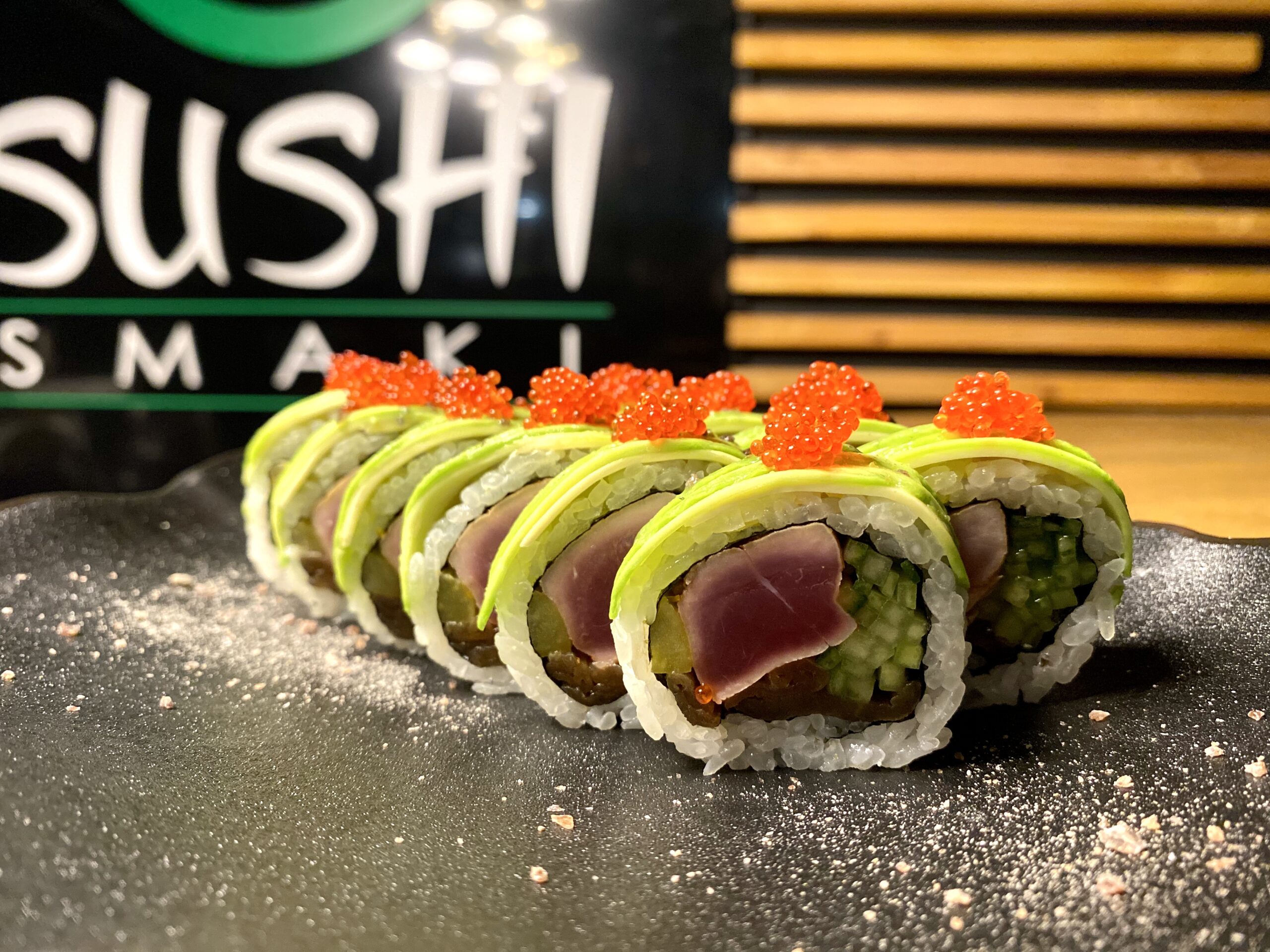 California z opiekanym tuńczykiem i warzywami owinięta awokado, posypana czarną solą i ikrą z latającej ryby.