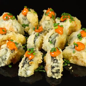 krewetka w tempurze, tatar z surimi, łosoś zawinięte w oryginalny omlet tamago