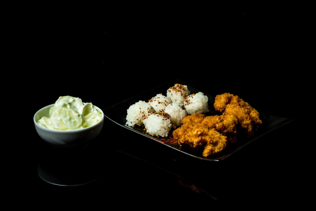 Stripsy z piersi kurczaka w panierce panko, podane z kuleczkami ryżowymi i mizerią.