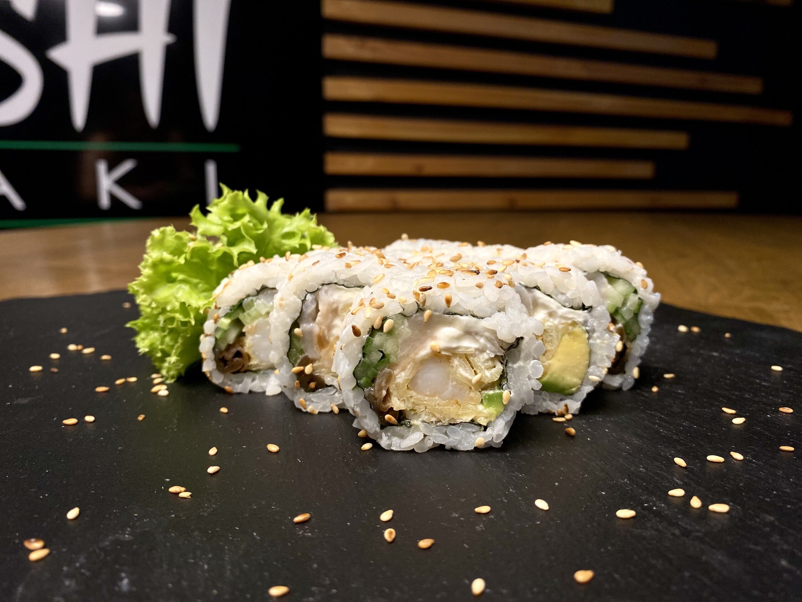 California z krewetką w migdałach z serkiem, kampyo, ogórkiem, awokado i liczi.